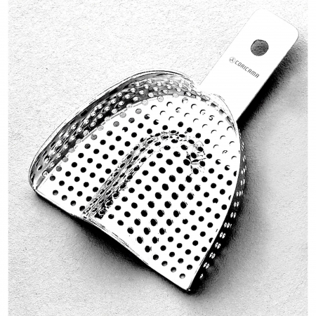 A horseshoe-shaped device made of metal or plastic, used to bring the impression material to the mouth, to fix it against the surfaces to be reproduced (e.g. teeth and gums) and to hold it in place while making the impression.