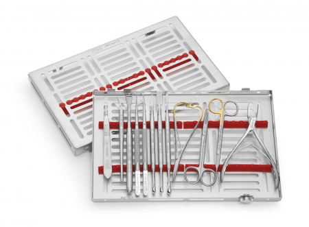 SCALPEL HANDLE N.3 mm125 BARD PARKER, SCALPEL HANDLE CURVED, NEEDLE HOLDER MATHIEU mm140 TC, SCISSOR GOLDMAN-FOX mm130 SUPERIOR CUT CURVED, SCISSOR SPENCER mm130, RETRACTOR MISCH N.2, TWEEZER ROUND mm175, TWEEZER ROUND mm175 CURVED, PERIOSTEAL ELEVATOR GOLDMAN-FOX N.14, PERIOSTEAL ELEVATOR PRICHARD, PERIOSTEAL ELEVATOR MOLT N.9, BONE RONGEUR MICRO FRIEDMAN, TRAY GAMMAFIX CINC RED
