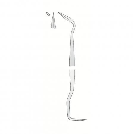 Lance-shaped blade for the mandibular region, combined with an elongated sickle blade for debridement of interdental areas.