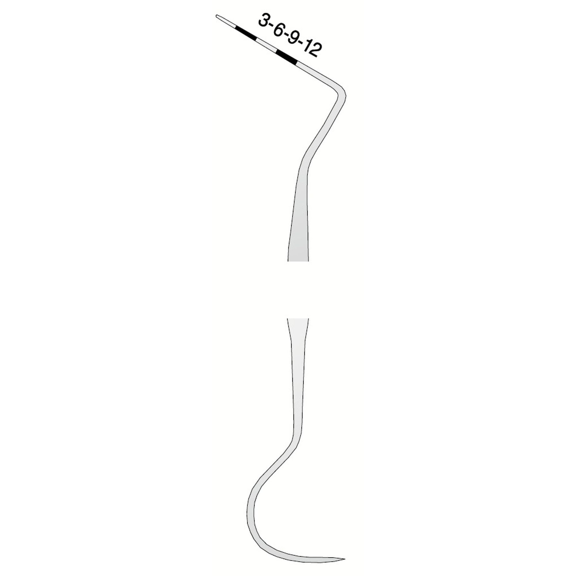 With its long, thin and blunt tip, it measures the depth of the pocket around the tooth in order to establish the state of health of the periodontium. The instrument has marks engraved on its head/tip for greater precision and legibility.