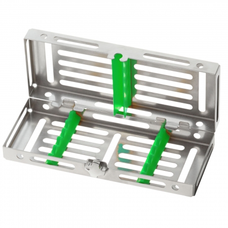 5 positions for 5 instruments. GAMMAFIX locking system keeps the tray perfectly closed in all conditions. Safe and easy joint system, totally hygienic. Holes’ dimension assure a perfect washing process and a safe sterilization. Open corners allow residuals and water to flow out from the tray and reduce drying time. The mark shows the opening position (lateral) and closing position (UP).