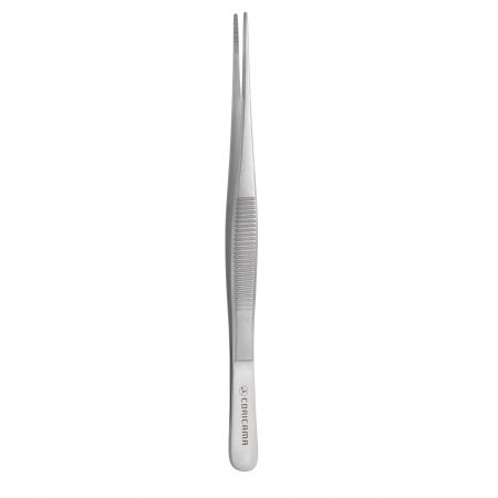 (aka: Thumb Forceps) Commonly held between the thumb and two or three fingers of one hand. Spring tension at one end holds the grasping ends apart until pressure is applied. Used to facilitate grasping, manipulation, compression or joining of tissue and ligature. It typically has two main designs: 1) a self-retaining, scissors-like design with ring handles and the working end having a variety of blade designs, e.g., straight, angled, or curved with parallel grooves or serrations to ensure grip; and 2) a tweezers-like design (may be a micro/fine instrument) with two conjoined blades with serrated tips at the working end.