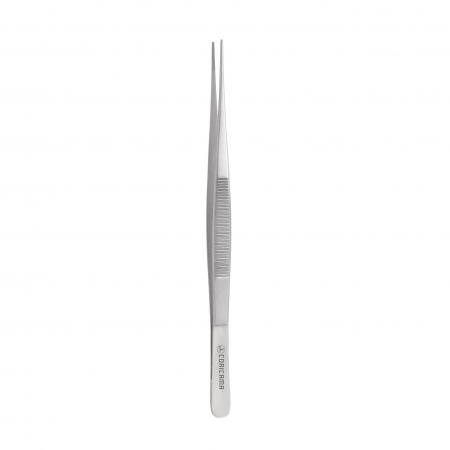 (aka: Thumb Forceps) Commonly held between the thumb and two or three fingers of one hand. Spring tension at one end holds the grasping ends apart until pressure is applied. Used to facilitate grasping, manipulation, compression or joining of tissue and ligature. It typically has two main designs: 1) a self-retaining, scissors-like design with ring handles and the working end having a variety of blade designs, e.g., straight, angled, or curved with parallel grooves or serrations to ensure grip; and 2) a tweezers-like design (may be a micro/fine instrument) with two conjoined blades with serrated tips at the working end.