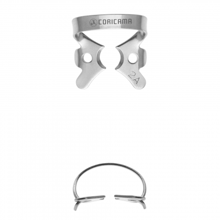 Used to anchor the rubber dam to the cervical region of an exposed tooth. Available in a variety of shapes, sizes, and designs to suit different situations. It is typically made of elastic metal, with bevelled jaws in contact with the tooth, and a bow that connects the jaws.