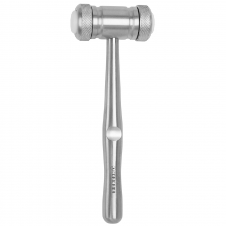 (aka: Surgical Hammer) Used to manually impart a force (i.e., strike) on another device (e.g., a chisel) during surgery. Available in a variety of designs and materials, the handle is typically made of metal (e.g., chromed iron or high quality stainless steel), but can also be made of synthetic materials (e.g., tufnol), and tapers distally to the head. The head is typically a solid, cylindrical shape normally being double-sided and made of solid (iron/steel) or shock absorbing materials (e.g., rubber, plastic, or tufnol).
