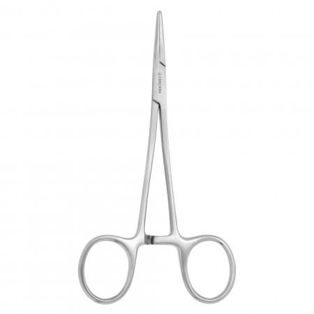 Locking forceps used to compress an artery to forestall bleeding. The thumb and middle or ring fingers grasp the finger loops, while the index finger helps guide the instrument, to facilitate handling. The locking mechanism consists of a series of interlocking teeth located near the finger loops that allow the user to adjust the clamping force of the pliers. As the forceps are closed, the teeth engage and keep the instrument’s tips from separating. A simple shift of the fingers is all that is needed to dis-engage the teeth and open the pliers.