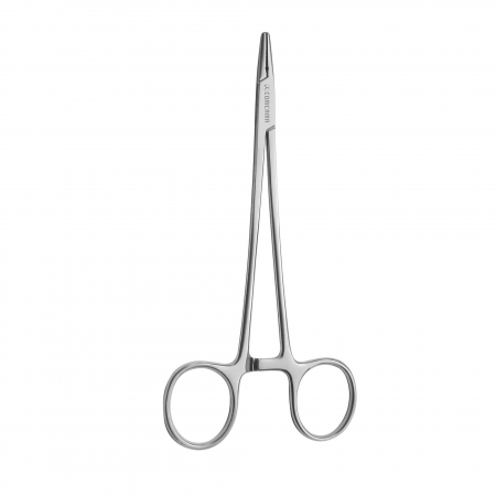 (aka: Suture Forceps) Used to grasp suture needles during suturing when pushing/pulling the needle and suture through tissue. It has short serrated jaws at the distal end to provide better grip of the needle and it is available in a wide variety of sizes and designs, such as: 1) a self-retaining, scissors-like design with ring handles at the proximal end; 2) a tweezer-like design with bowed, hinged handles that are operated by squeezing them together; and 3) a heavy-duty pincer-like design. some types may have inserts made of hard materials (e.g., tungsten carbide) and include scissor blades.