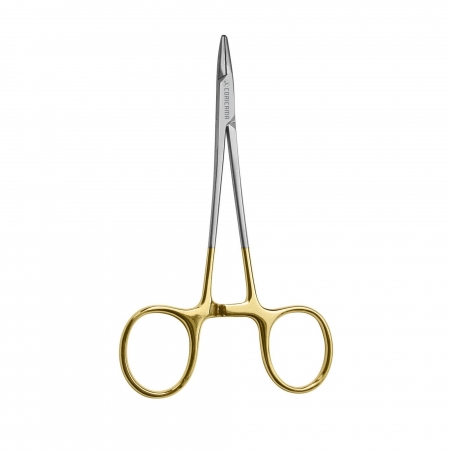 (aka: Suture Forceps) Used to grasp suture needles during suturing when pushing/pulling the needle and suture through tissue. It has short serrated jaws at the distal end to provide better grip of the needle and it is available in a wide variety of sizes and designs, such as: 1) a self-retaining, scissors-like design with ring handles at the proximal end; 2) a tweezer-like design with bowed, hinged handles that are operated by squeezing them together; and 3) a heavy-duty pincer-like design. some types may have inserts made of hard materials (e.g., tungsten carbide) and include scissor blades.