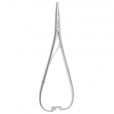 (aka: Suture Forceps) Used to grasp suture needles during suturing when pushing/pulling the needle and suture through tissue. It has short serrated jaws at the distal end to provide better grip of the needle and it is available in a wide variety of sizes and designs, such as: 1) a self-retaining, scissors-like design with ring handles at the proximal end; 2) a tweezer-like design with bowed, hinged handles that are operated by squeezing them together; and 3) a heavy-duty pincer-like design. some types may have inserts made of hard materials (e.g., tungsten carbide) and include scissor blades.