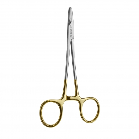 (aka: Suture Forceps) Used to grasp suture needles during suturing when pushing/pulling the needle and suture through tissue. It has short serrated jaws at the distal end to provide better grip of the needle and it is available in a wide variety of sizes and designs, such as: 1) a self-retaining, scissors-like design with ring handles at the proximal end; 2) a tweezer-like design with bowed, hinged handles that are operated by squeezing them together; and 3) a heavy-duty pincer-like design. some types may have inserts made of hard materials (e.g., tungsten carbide) and include scissor blades.
