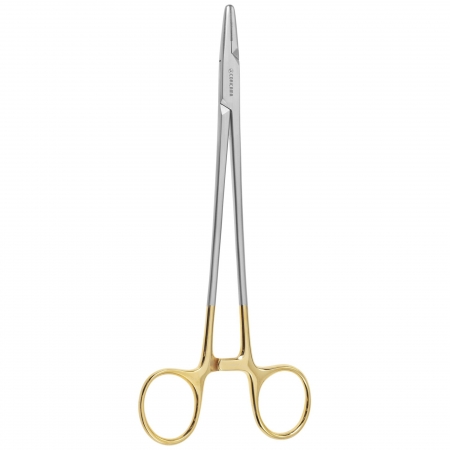 (aka: Suture Forceps) Used to grasp suture needles during suturing when pushing/pulling the needle and suture through tissue. It has short serrated jaws at the distal end to provide better grip of the needle and it is available in a wide variety of sizes and designs, such as: 1) a self-retaining, scissors-like design with ring handles at the proximal end; 2) a tweezer-like design with bowed, hinged handles that are operated by squeezing them together; and 3) a heavy-duty pincer-like design. some types may have inserts made of hard materials (e.g., tungsten carbide) and include scissor blades.