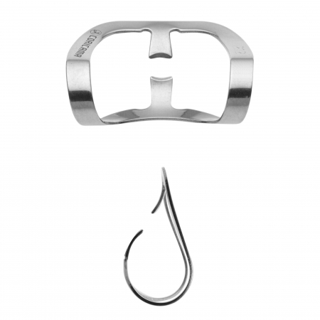 Used to anchor the rubber dam to the cervical region of an exposed tooth. Available in a variety of shapes, sizes, and designs to suit different situations. It is typically made of elastic metal, with bevelled jaws in contact with the tooth, and a bow that connects the jaws.