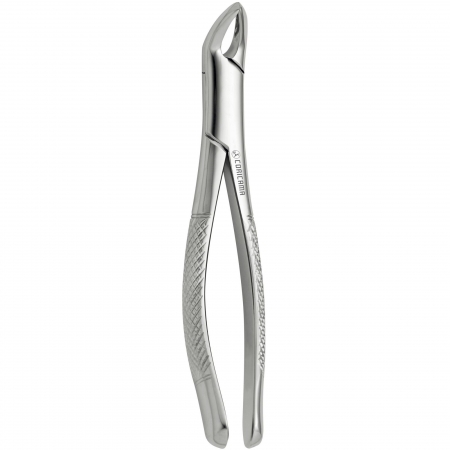 Forceps no. 151 are mainly used for extracting mandibular anteriors, bicuspids and roots. They are often known as mandibular universal forceps. This type is similar to forceps no. 150, with the exception of the head, which is placed at an angle opposite to that of the handles, which are slightly curved.