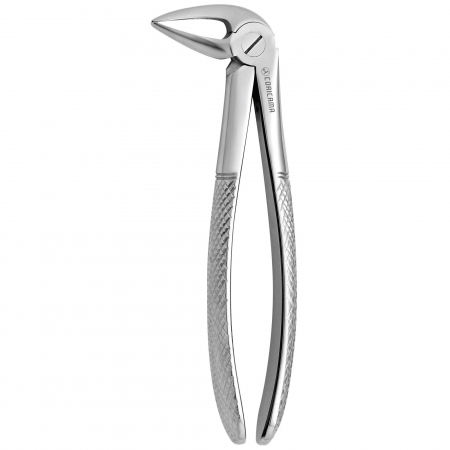 The operator must find the forceps with the most suitable grip and the blades should adapt to the tooth with its beaks grasping the root bifurcations. When using forceps to extract a tooth, two types of movements are made. First, the gingival and periodontal ligament are cut: the blades should be positioned below the gingival margin on the buccal and lingual parts of the tooth and then driven with increasing force in an apical direction. In this way,they slide over the length of the root surface to the final part rather than gripping it from the outset. Positioning the forceps in the most apical position possible ensures that the mechanical efficiency of subsequent extraction movements is maximal and the risk of root fracture is minimized. The second movement removes the tooth from the alveolus. Whilst the apical position reach in the first movement is maintained, the tooth should be gripped firmly with the blades and dislocated from its bony socket. This allows the alveolus to dilate and the tooth to be lifted out. The movements involved should be slow and targeted, allowing the alveolus to expand; their direction will be determined by the anatomy and position of the tooth being removed.