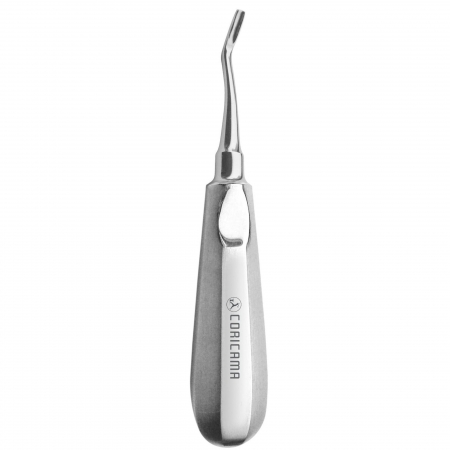 Used as a lever for the extraction of a tooth or retained roots. It is pushed in between the gums and the external part of the tooth and used to loosen the tissue surrounding the tooth. The blade transmits a force, generated by rotating the handle around its long axis, to the surface of the tooth or root. This produces the displacement of the tooth away from the point of application where the elevator comes into contact with the tooth. The force may be applied perpendicularly to the tooth, with the elevator placed in the interdental space, or along its long axis. Since considerable force is applied to the tooth, it’s necessary to prevent the elevator from slipping. During its use, the operator’s index finger should therefore be extended over the length of the blade to act as a support on adjacent hard tissues. The curved blade of the elevator is placed on the root surface, thus lying between the tooth and the alveolar bone which acts as a fulcrum around which the elevator is turned. The rotation of the elevator will produce a force which dislocates the tooth and tends to displace it out of its socket. An equal force will also be applied to the fulcrum, so it is important to ensure that this alveolar bone is capable of resisting such a force and that is not an adjacent tooth which may, as a result, become inadvertently loosened or displaced. Elevators must be used with caution when extracting teeth to avoid generating excessive and potentially damaging forces.