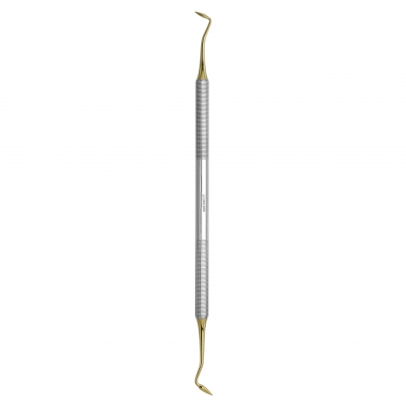 The titanium coating of instruments (in yellow) minimizes the adhesion of composite.