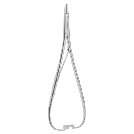 (aka: Suture Forceps) Used to grasp suture needles during suturing when pushing/pulling the needle and suture through tissue. It has short serrated jaws at the distal end to provide better grip of the needle and it is available in a wide variety of sizes and designs, such as: 1) a self-retaining, scissors-like design with ring handles at the proximal end; 2) a tweezer-like design with bowed, hinged handles that are operated by squeezing them together; and 3) a heavy-duty pincer-like design. some types may have inserts made of hard materials (e.g., tungsten carbide) and include scissor blades.