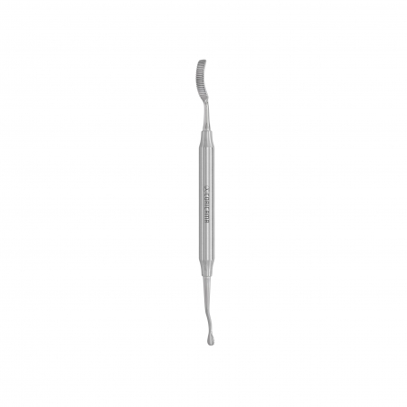 Instrument with various shapes and cutting surfaces. One or both distal working ends are used to cut and smooth (file) bone tissue.