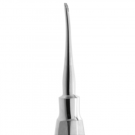 Used as a lever for the extraction of a tooth or retained roots. It is pushed in between the gums and the external part of the tooth and used to loosen the tissue surrounding the tooth. The blade transmits a force, generated by rotating the handle around its long axis, to the surface of the tooth or root. This produces the displacement of the tooth away from the point of application where the elevator comes into contact with the tooth. The force may be applied perpendicularly to the tooth, with the elevator placed in the interdental space, or along its long axis. Since considerable force is applied to the tooth, it’s necessary to prevent the elevator from slipping. During its use, the operator’s index finger should therefore be extended over the length of the blade to act as a support on adjacent hard tissues. The curved blade of the elevator is placed on the root surface, thus lying between the tooth and the alveolar bone which acts as a fulcrum around which the elevator is turned. The rotation of the elevator will produce a force which dislocates the tooth and tends to displace it out of its socket. An equal force will also be applied to the fulcrum, so it is important to ensure that this alveolar bone is capable of resisting such a force and that is not an adjacent tooth which may, as a result, become inadvertently loosened or displaced. Elevators must be used with caution when extracting teeth to avoid generating excessive and potentially damaging forces.