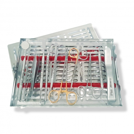 MANGO ESPEJO MOD. LISO ø 8mm + ESPEJO N.5 RODIO, PINZA COLLEGE mm150 LISA, MANGO PARA BISTURÍ CURVO, ELEVADOR DE PERIOSTIO PRICHARD, PINZA MICRO ADSON mm0.9 1×2, TIJERA GOLDMAN-FOX mm130, PORTA AGUJAS CRILE-WOOD mm150 TC, TIJERA IRIS mm115 CORTE SUPERIOR, RETRACTOR MINNESOTA UNIVERSITY, PINZA HALSTEAD-MOSQUITO mm125, CURETA PARA HUESO LUCAS N.86, BANDEJA GAMMAFIX QUATRI ROJO