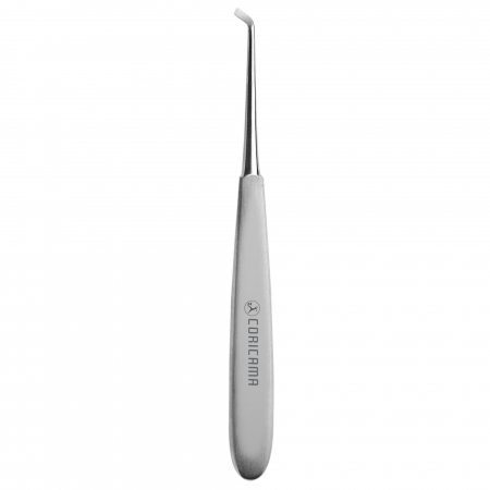 Lama corta e arrotondata con impugnatura piatta, utilizzata per l’elevazione di radici ritenute, denti decidui, denti anteriori inferiori. Utilizzata, con attenzione, anche per la creazione di finestre ossee.