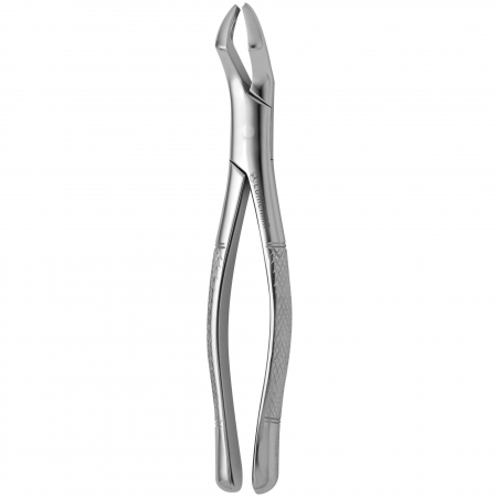 In abbinamento con N. 53-L. Ogni becco ha un design diverso per adattarsi alle radici molari mascellari che differiscono anatomicamente sulla superficie facciale e linguale: becco arrotondato per la radice linguale e becco appuntito per la biforcazione della radice mesiale-buccale e distale-buccale. Un manico curvo e uno diritto.