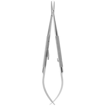 Usato per afferrare gli aghi da sutura durante la sutura quando si spinge/tira l’ago e si sutura attraverso il tessuto. Ha ganasce seghettate corte all’estremità distale per assicurare una migliore presa dell’ago ed è disponibile in un’ampia varietà di dimensioni e modelli, ad esempio: 1) un design a forbice autobloccante con branche ad anello all’estremità prossimale; 2) un design a pinzetta con estremità ad arco che vengono utilizzate premendole insieme; e 3) un design a pinza ad alta resistenza. Alcuni modelli possono presentare inserti in materiali duri (ad esempio, carburo di tungsteno) e includere lame a forbice.