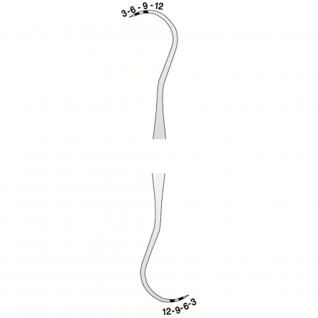 Con la sua punta lunga, sottile e smussata misura la profondità della tasca intorno al dente al fine di stabilire lo stato di salute del parodonto. Lo strumento è costituito da segni incisi sulla testa per maggiore precisione e leggibilità.